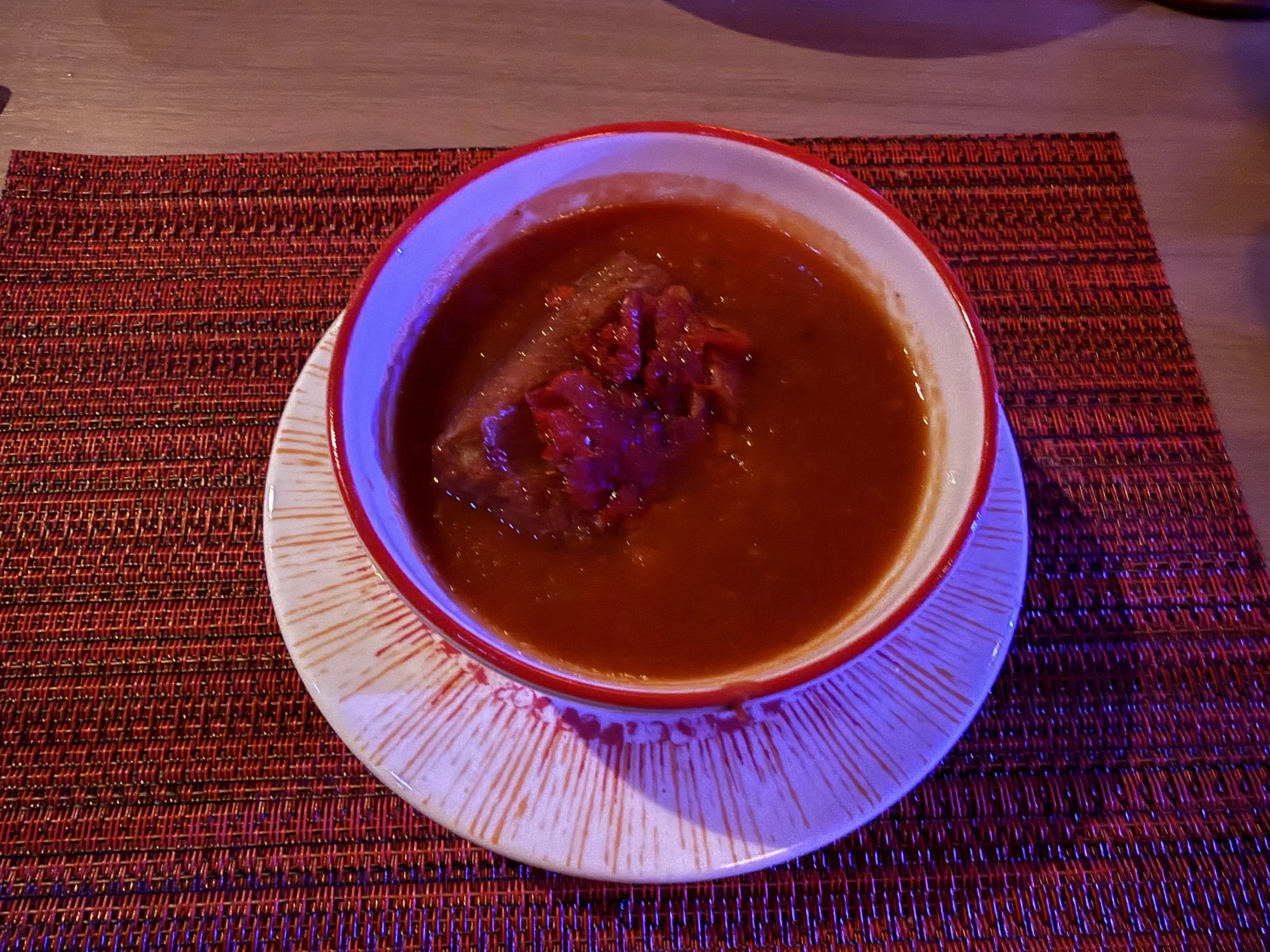 Genuinely tasty—sweet, tangy, and nicely seasoned. The crostini was a bit soggy, but the soup itself was very good.